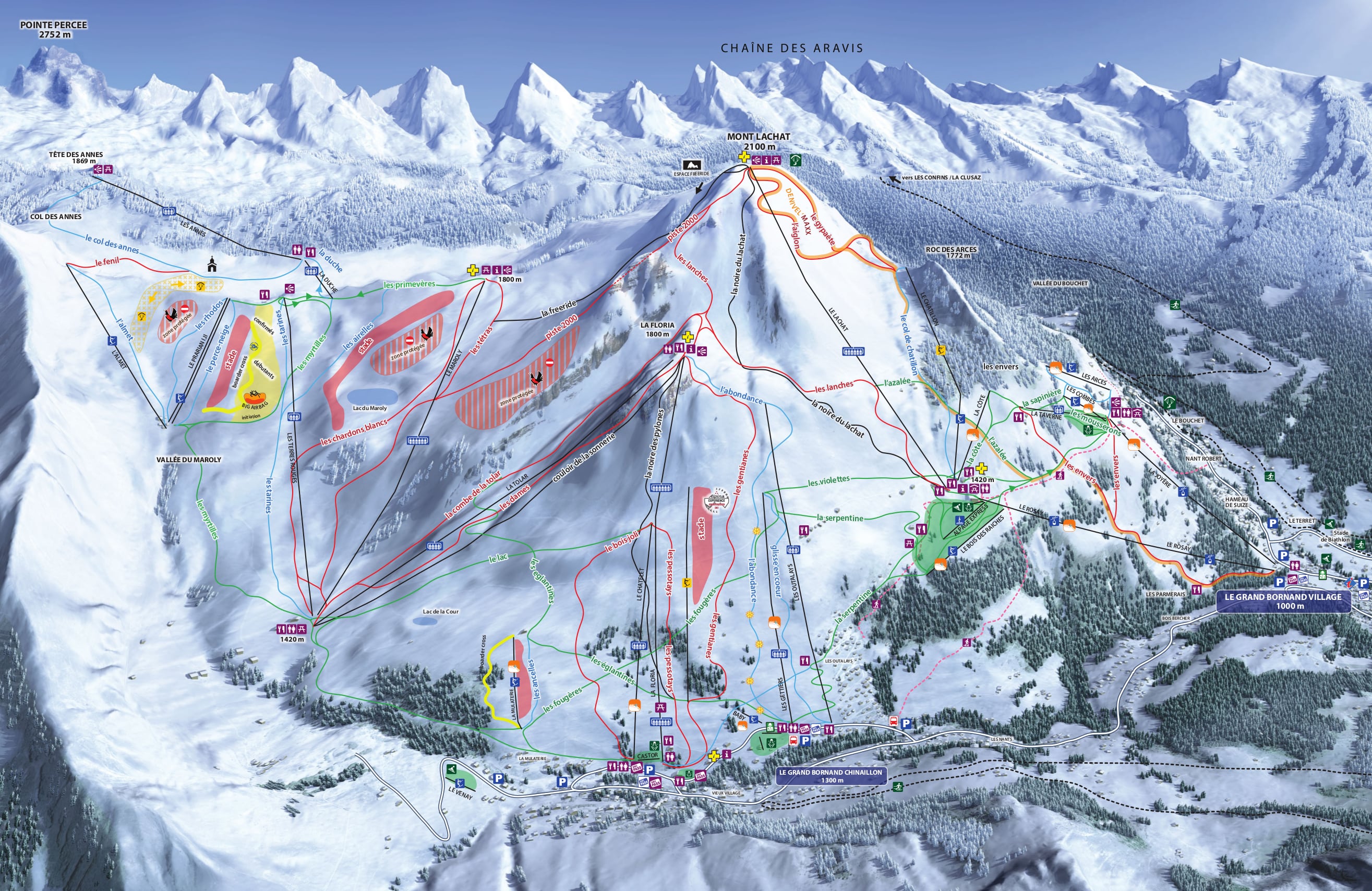 Part of the Massif Des Aravis, Le Grand Bornand has 90 km of slopes and 37 ski-lifts spread around the Mont Lachat, the highest peak at 2100 m.